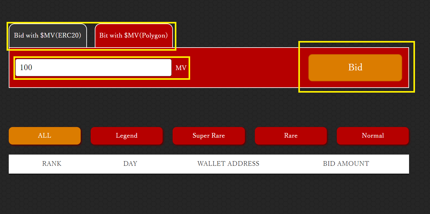 * Minimum bidding amount is 100MV. - After typing in your bidding information, click the "Bid" button and your bidding process will be completed.