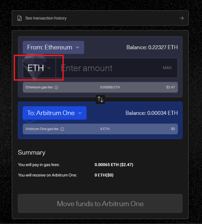 - Press the "Move funds to Arbitrum One" button located at the bottom of the screen.