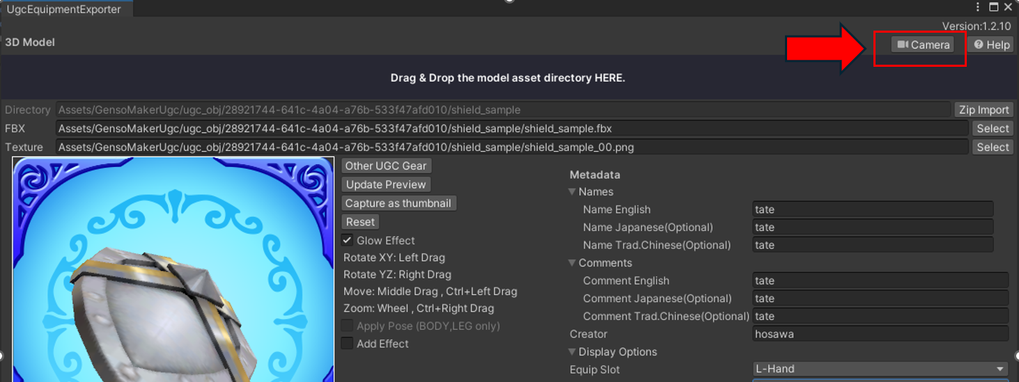 In the Unity Plugin version, a camera button has been added to the top-right corner of the UgcEquipmentExporter. When pressed, camera arrow buttons will appear in a separate window for easier camera control.