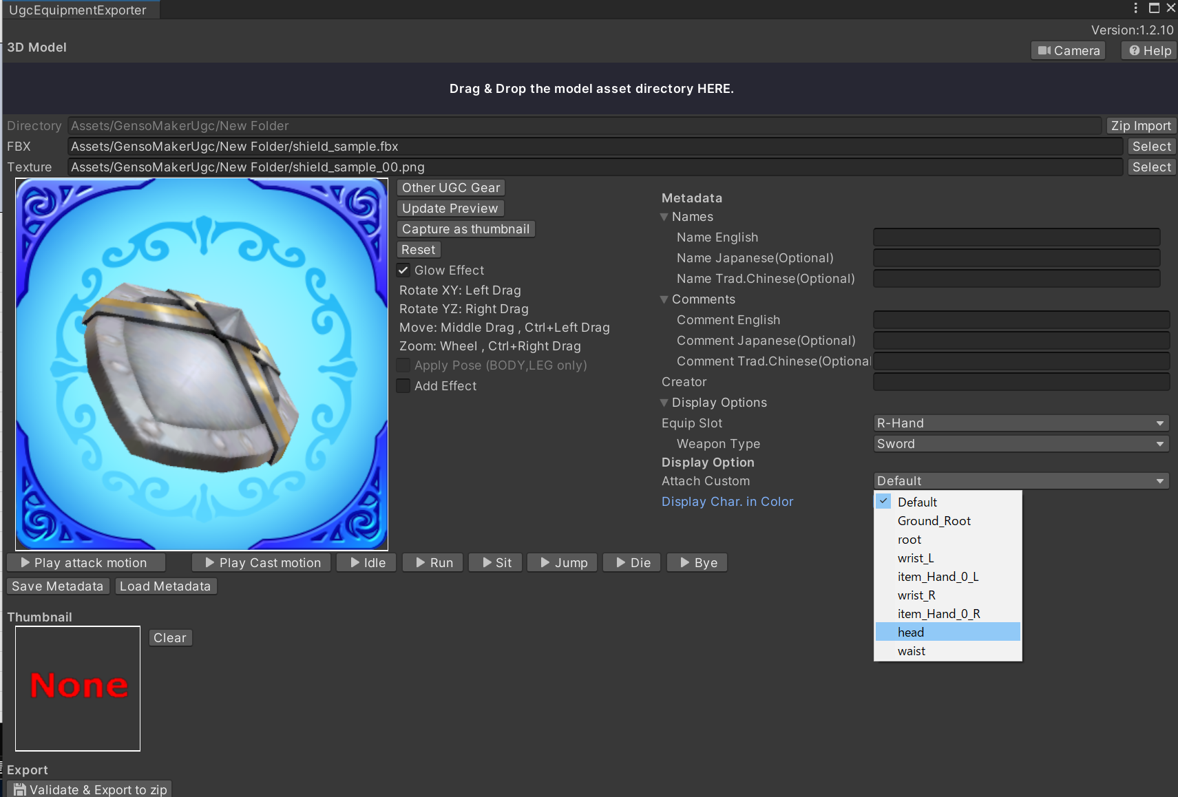 Similarly, in the Unity Plugin version, you can change the display position by selecting the part from the Attach Custom option located at the bottom-right.