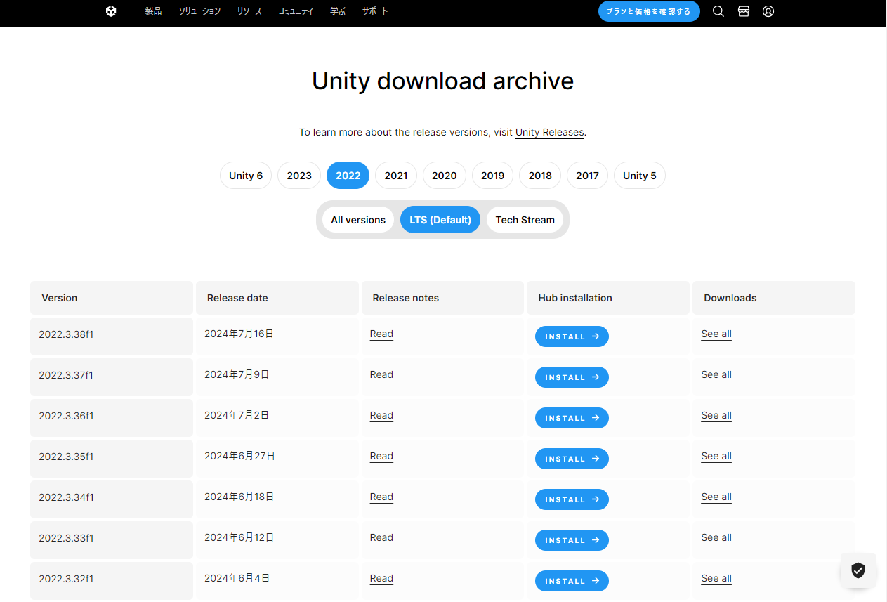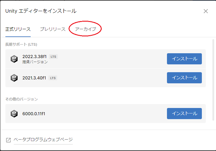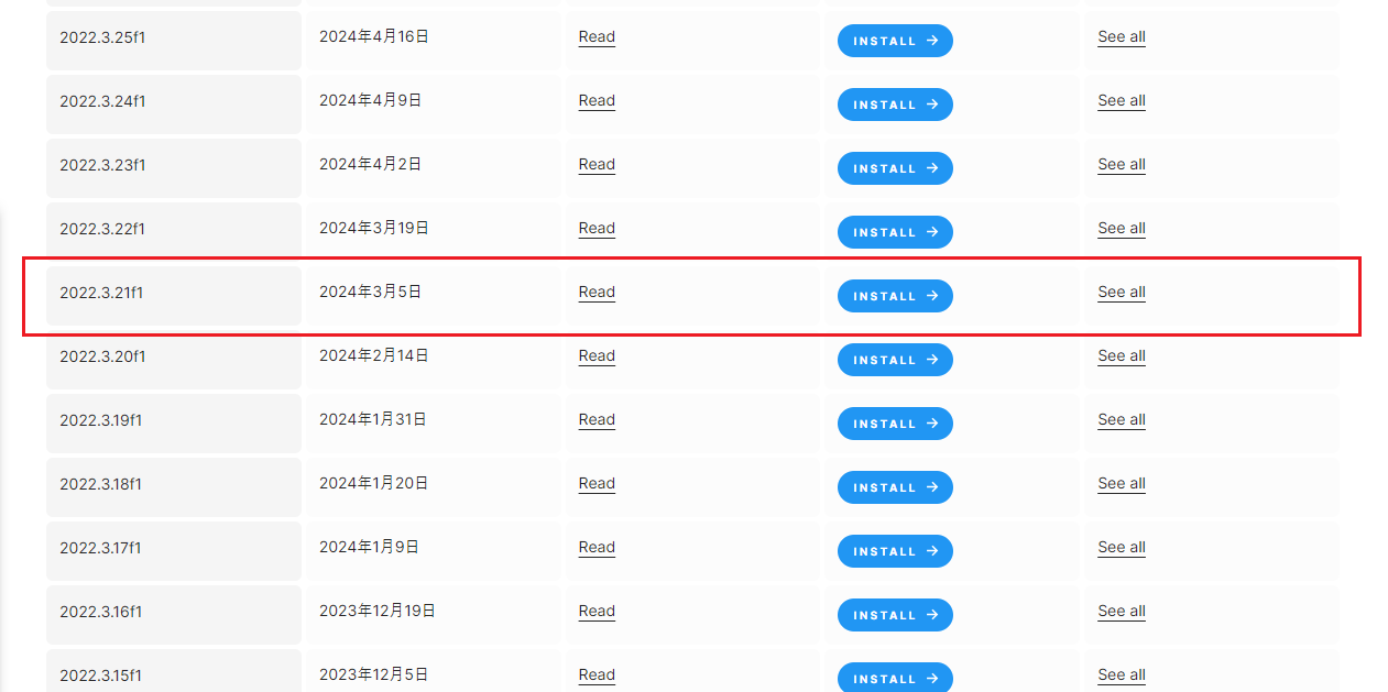 ・Install "Unity2022.3.21f1" from the archive page using the blue "INSTALL →" button.