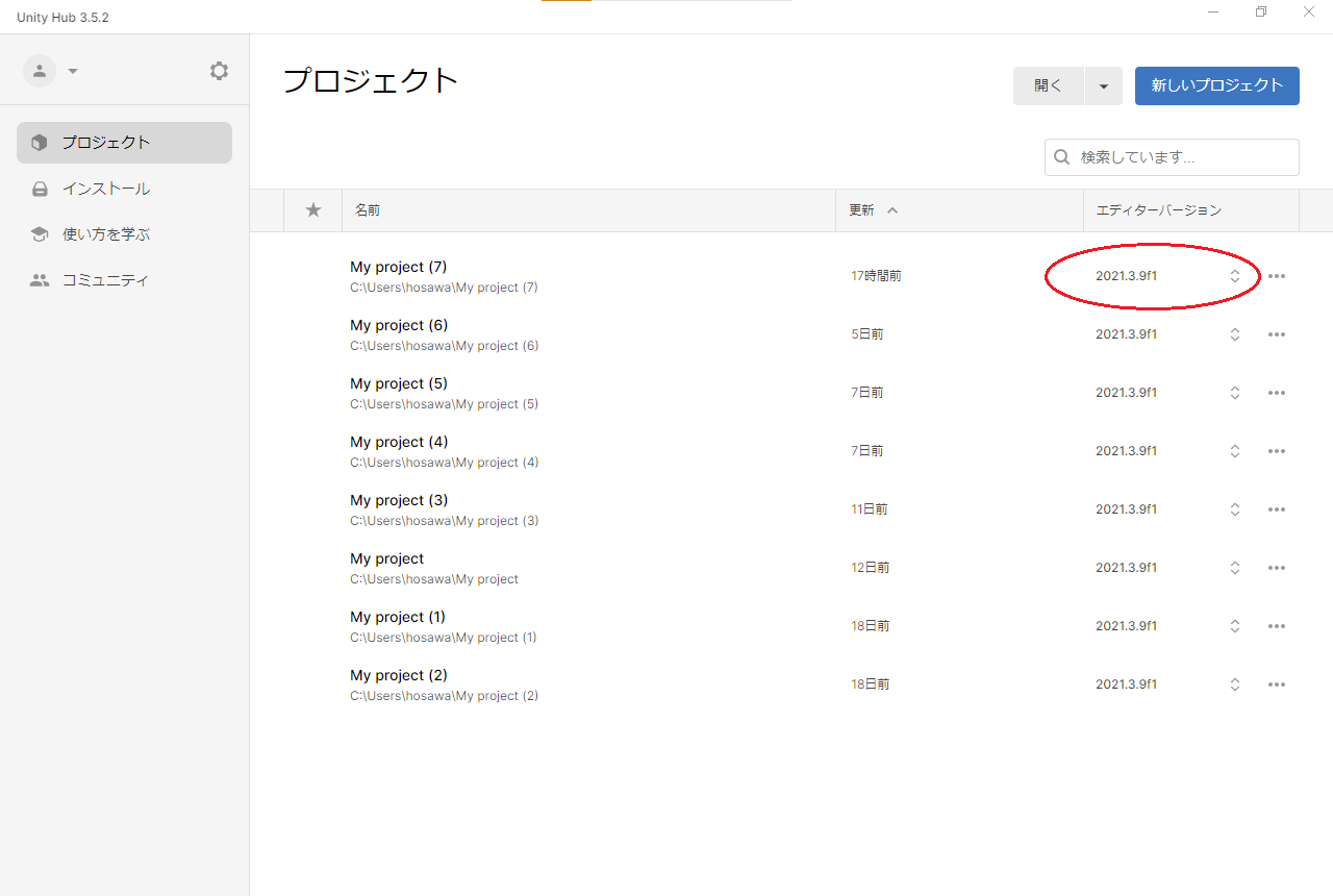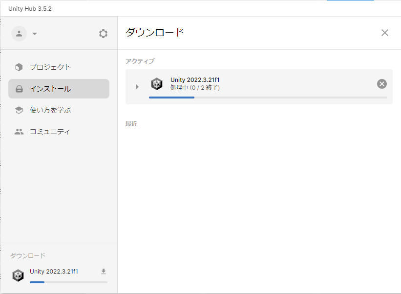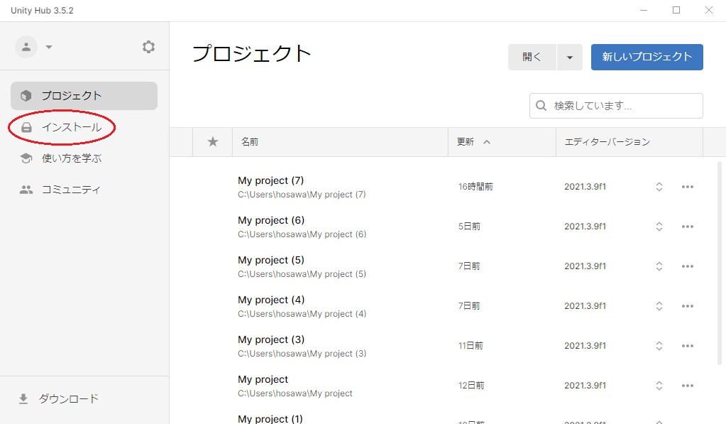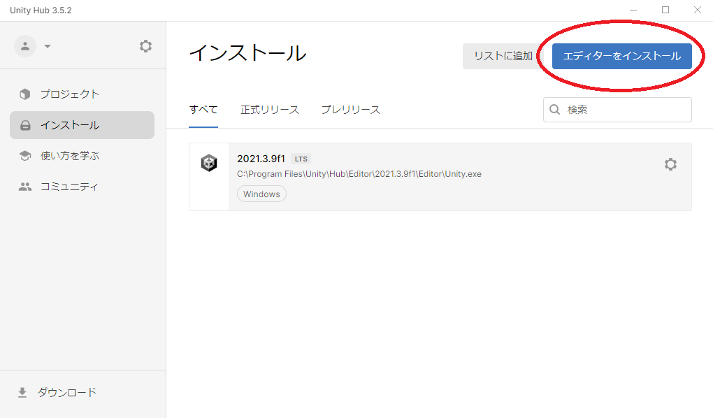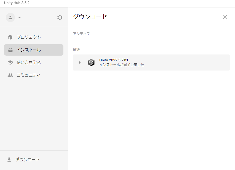 ・Press the left hand button "Unity Hubに戻る" after pressing "INSTALL →" to return to Unity.