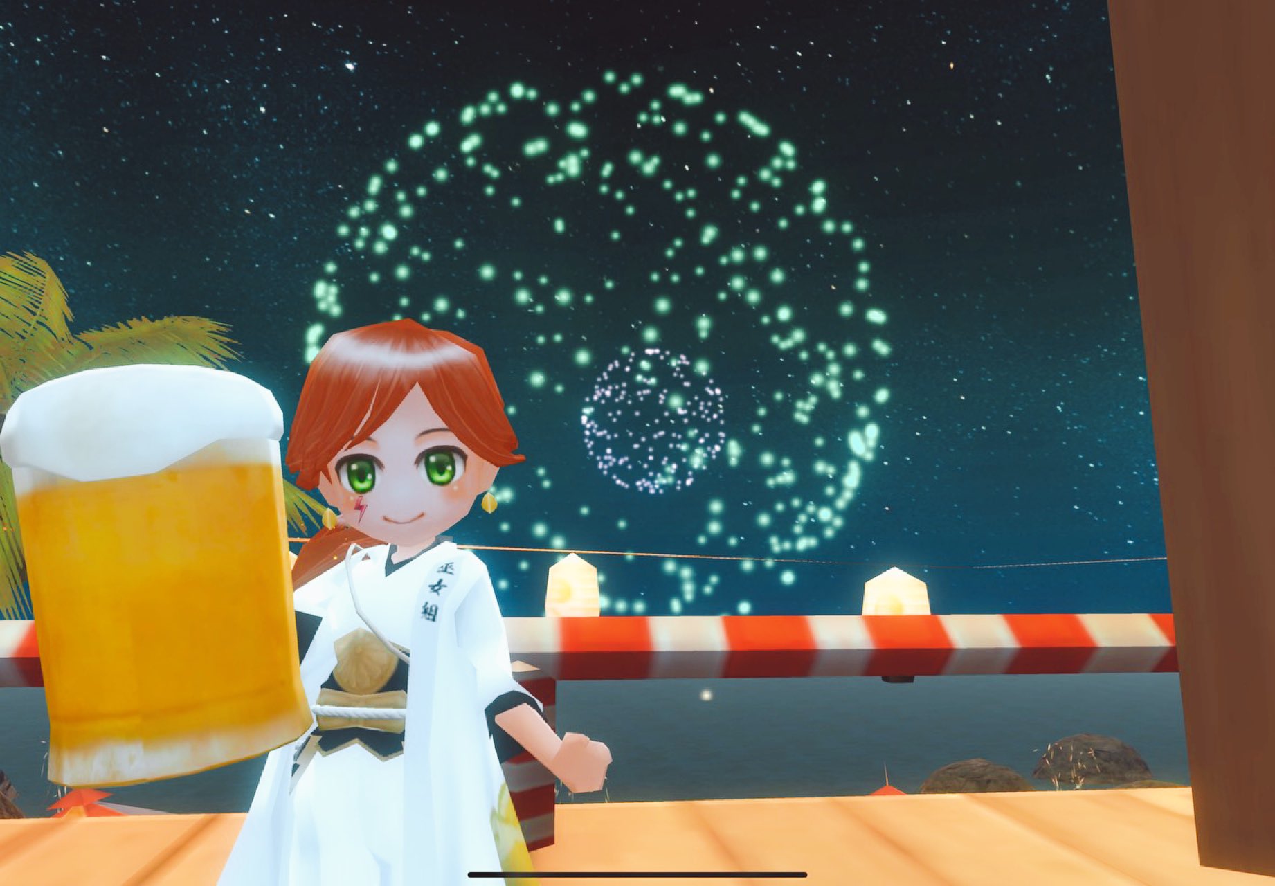 Drinking beer with a giant fireworks display in the background—absolutely perfect!