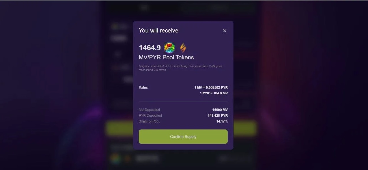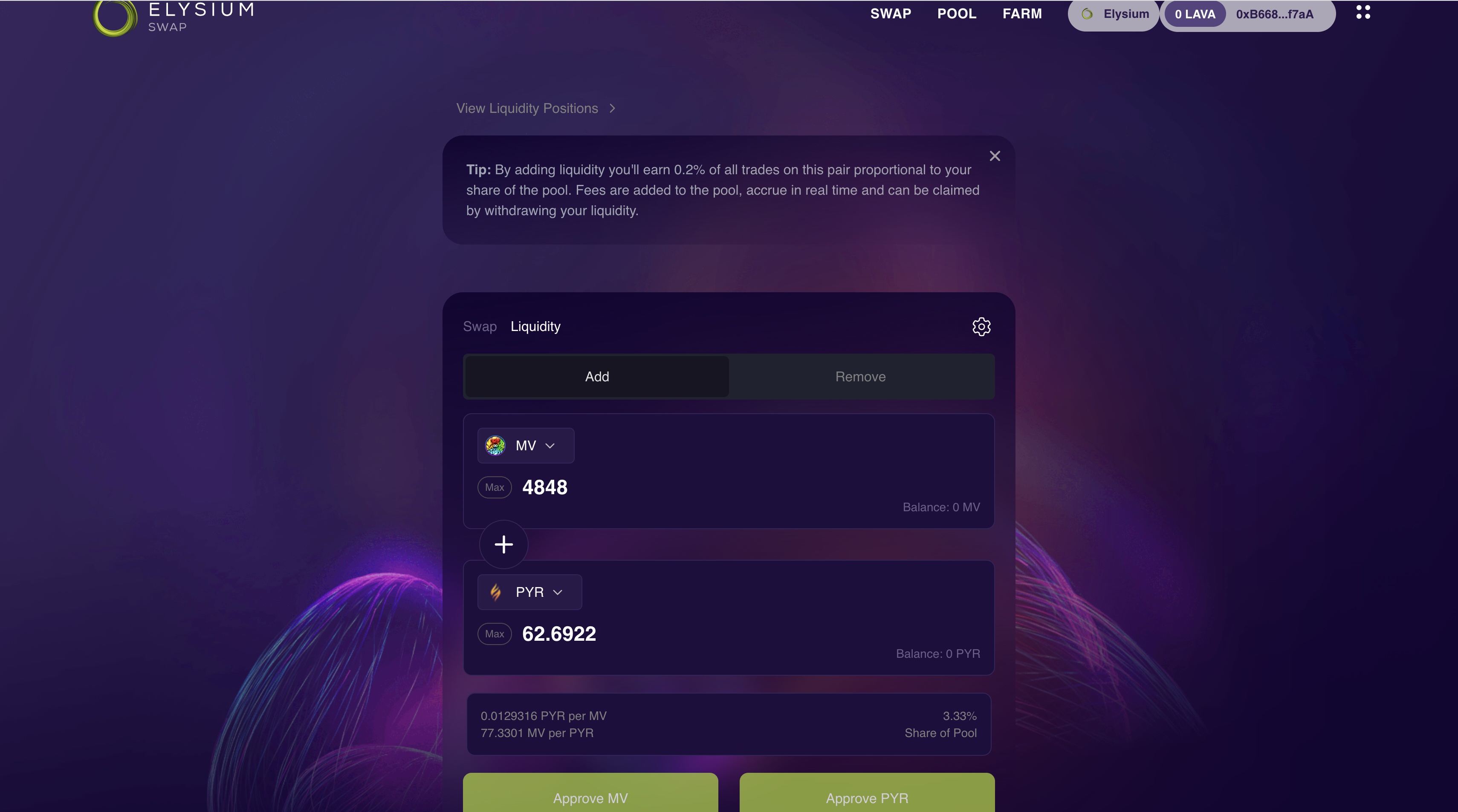 ⑤Add both tokens to the MV-PYR liquidity pool on Elysium DEX and get LP tokens in return.