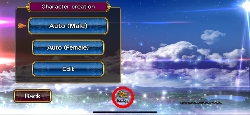 • After "Automatic account issuance", when the game starts, tap the Settings button (gear icon) at the bottom of the screen.