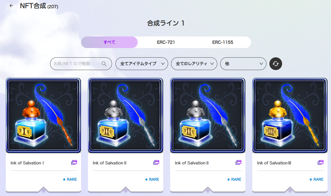 マーケットプレイスの「NFT合成」にて、防衛戦で入手できる「インク」素材の