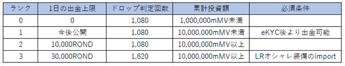 ・お客様からもご要望が大きかった点として「ログインしてから1日6時間まで」のドロップ判定を受けることができなかったシステムの変更を行い、「1日にドロップ判定を受けられる回数」を出金ランクテーブルに応じて設定することに致しました。