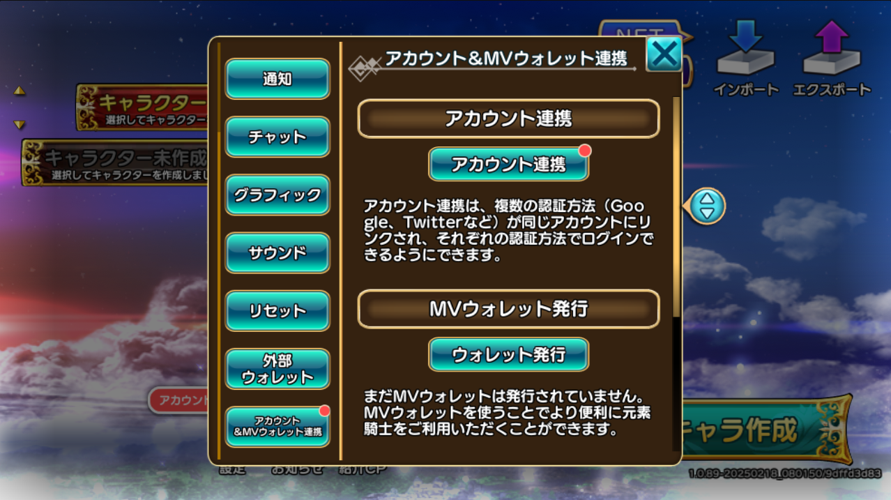 ・GENSOマーケットプレイスもMVウォレットをご利用いただけます。ウォレット接続の際、「元素騎士のアカウントでログイン」を選択いただき、MVウォレット発行時のアカウントでログインするようお願いいたします。 - iOSアプリ版をご利用中の方もキャラクター選択画面でNFT、FTのインポート、エクスポート画面を表示されるようにします。