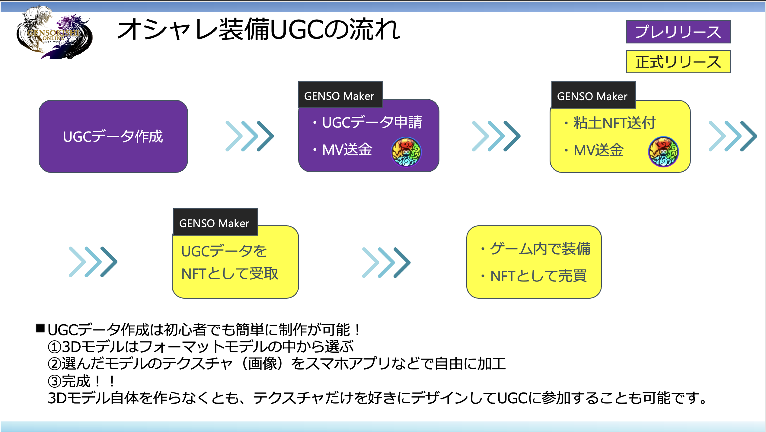 プレリリースではUGCデータの申請までが可能でしたが、本日公開の本リリースからは、NFT化⇨ゲーム内で使用&マーケットプレイスで売買までの機能までアップデートされております!