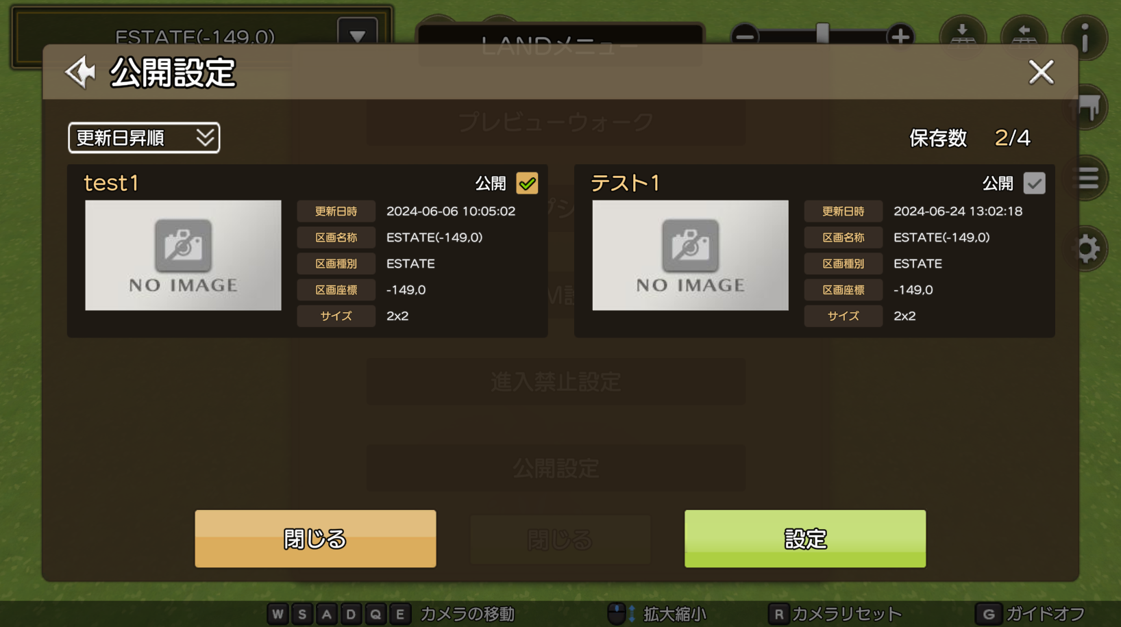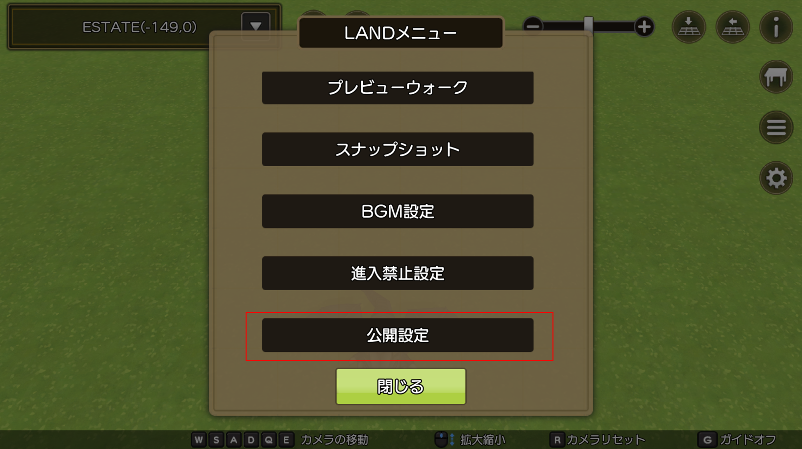 現在保存しているセーブデータから1つを選択し、「公開」にチェックをいれることで「LAND Viewer」上で入場が可能になります。