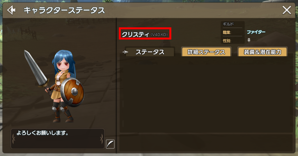 ※ キャラクター名・アカウントID名は、キャラクターステータス画面に表示されています