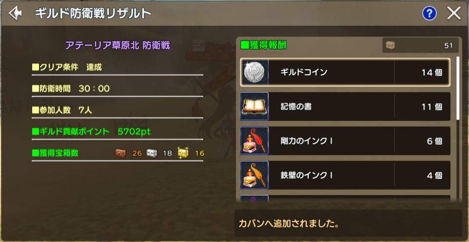 防衛戦に参加したキャラクターで次回ログインした際に宝箱の中身アイテムが補填されます。