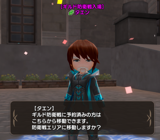 予約していた時間になったギルドメンバーの方は、エルロンド商店街美術館前の「タエン」から防衛戦マップへ入場できます。