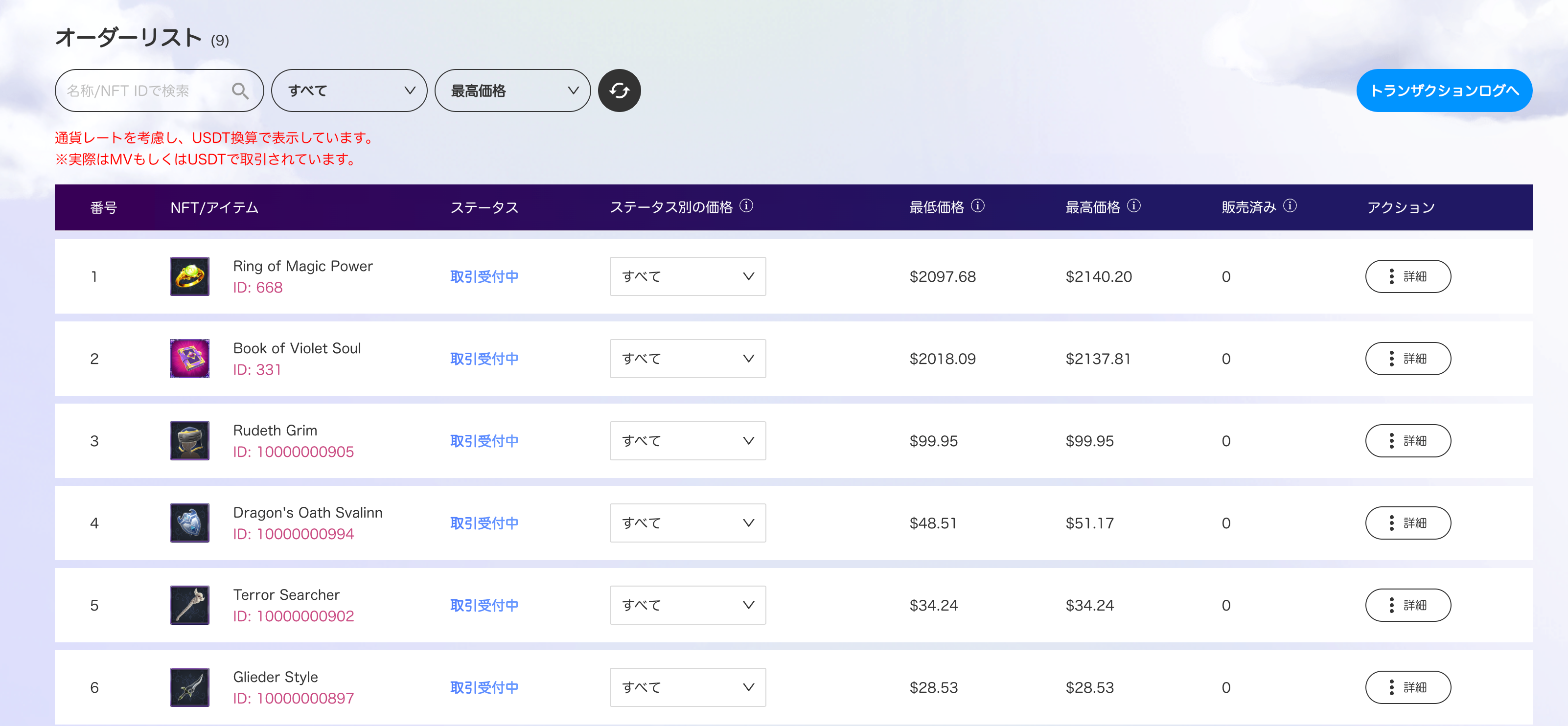 ① 新たに追加される「すべてのオーダー」にアクセスし、自分が持っていて売却したいオーダーを見つけ詳細ボタンを押します。