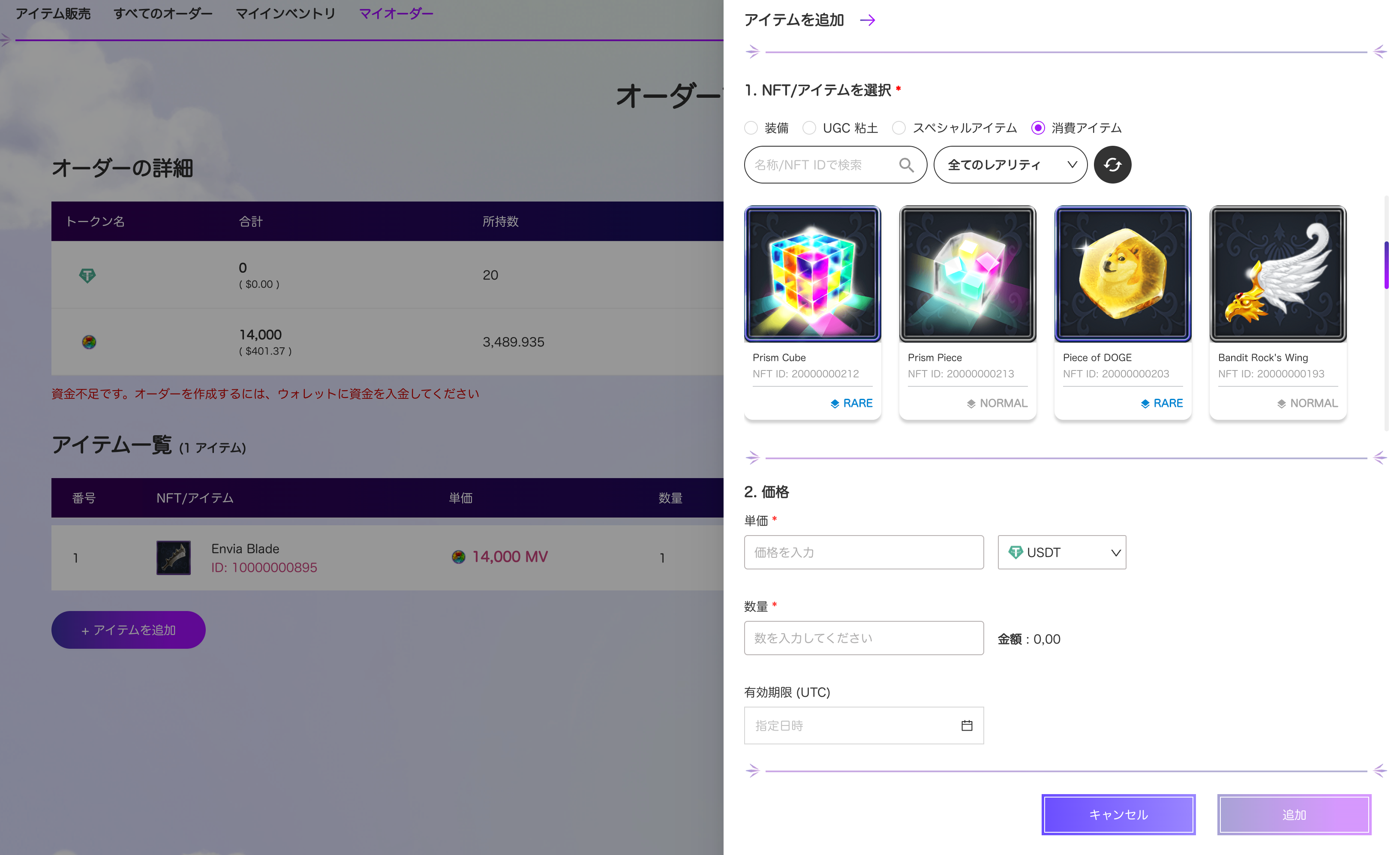 ① 新たに追加される「マイオーダー」にアクセスし、オーダーを作成 → アイテムを追加のボタンを押して購入したいNFTをリストから選んで選択し、いくらでいくつ購入したいのかを入力の上「確認」ボタンを押下して、オーダーリストを作成します。