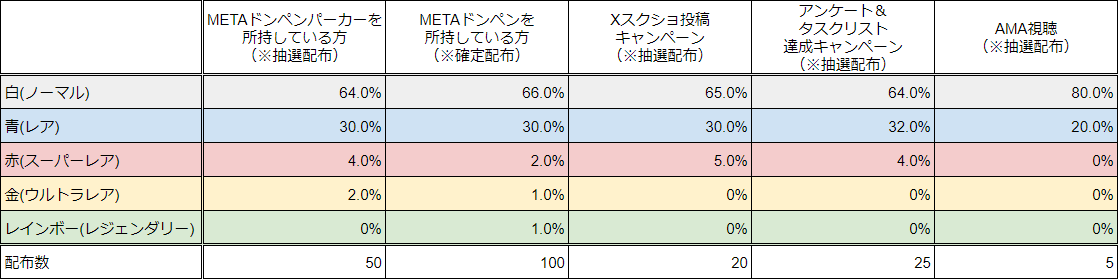 ・どのレアリティのドBOX-NFTが手に入るかは、下記表の確率による抽選で決定いたします(※各キャンペーン詳細については、後述をご覧ください)
