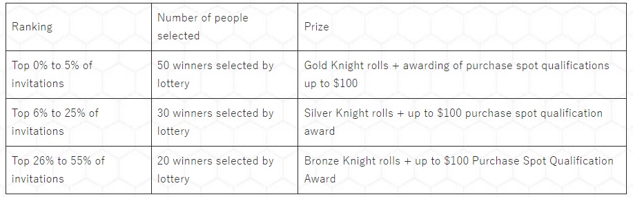 以及如果您是排名前10的順位,將直接擁有Gold Knight的角色並獲得$100的購入額度權利。請活用大家的影響力來活躍社群吧!!