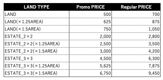 本次,我們將只出售地理位置優越的元素騎士附近的區域。 請參考下方的價格表。因LAND類型和位置不同售價也將不同,請大家參考價格。此外,本次將以活動價格進行出售!(LAND正常售價預定為700USDT起。)