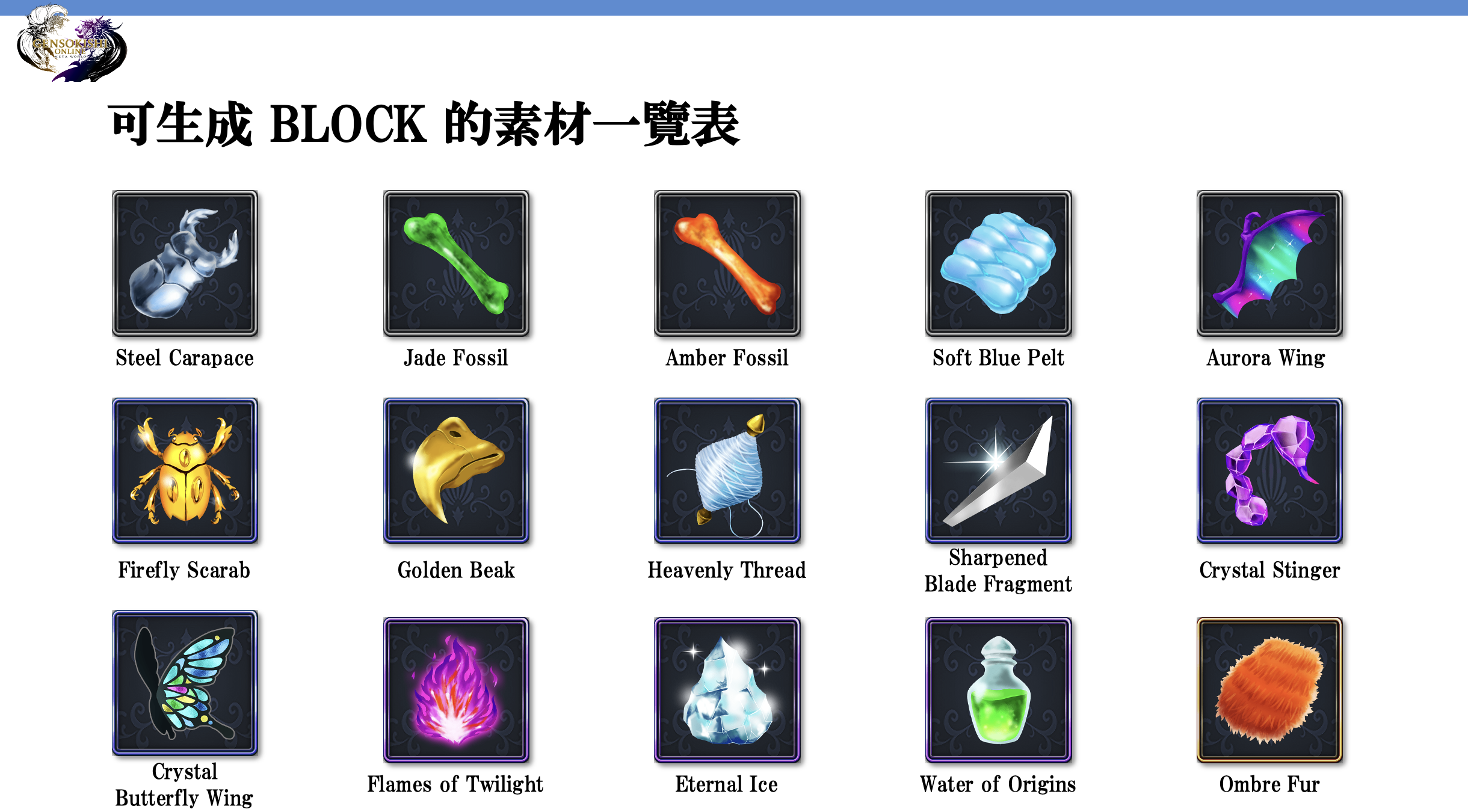 ・下列在遊戲中掉落物品可以生成BLOCK。