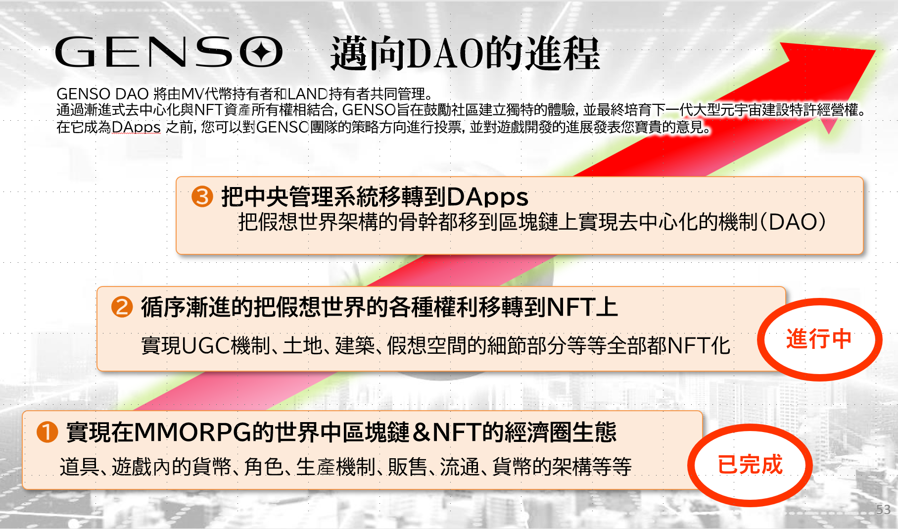 至今,GENSO已經根據路線圖實現了既定承諾,並且順利推進了項目。近期,GENSO通過建立各種用於元宇宙化的工具和開發環境,順利進行DAO化的進展。