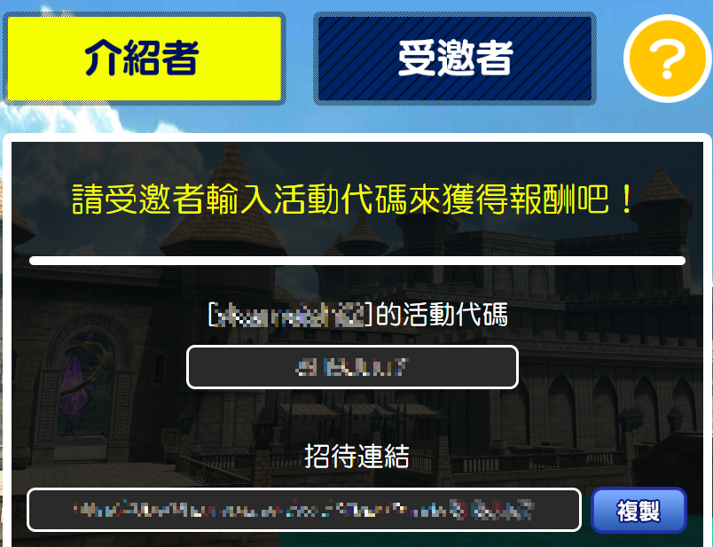 ② 希望成為邀請者的玩家,請將自己的邀請代碼或邀請連結複製下來,分享給想要邀請的親朋好友。
